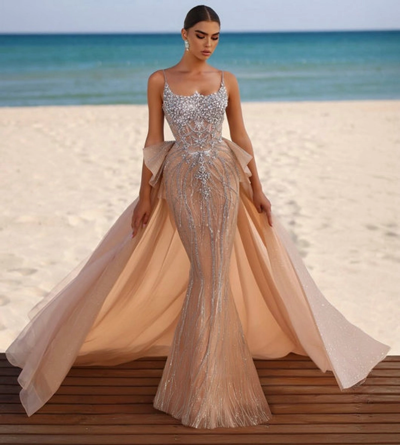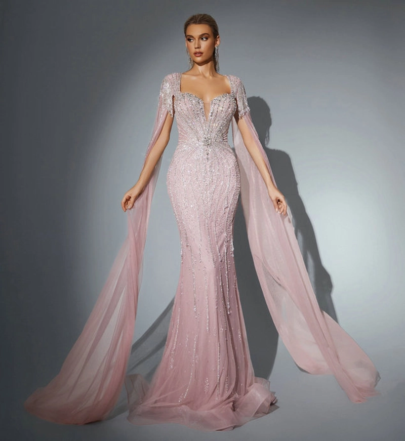 We offer a hot sale new style prom evening gown featuring elegant cape sleeves, exquisitely embellished with beaded crystals for a sophisticated and glamorous look. This gown is designed to provide a perfect fit and graceful silhouette, making it ideal for formal occasions, proms, weddings, and special events. Crafted from high-quality materials, it ensures comfort and durability while maintaining a luxurious appearance. The intricate crystal embellishments add sparkle and elegance, enhancing the overall design and style. Available in multiple sizes and custom options, this gown caters to individual preferences and body shapes. It is a perfect choice for anyone seeking a standout, fashionable outfit for memorable formal events.