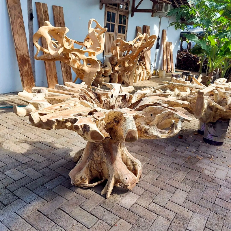 A handcrafted console table made from natural teak root combined with clear epoxy resin. The organic teak root structure creates a unique artistic form, while the epoxy resin adds strength and a modern touch. Each piece is one of a kind, suitable for entryways, living spaces, hotels, and luxury interior projects.