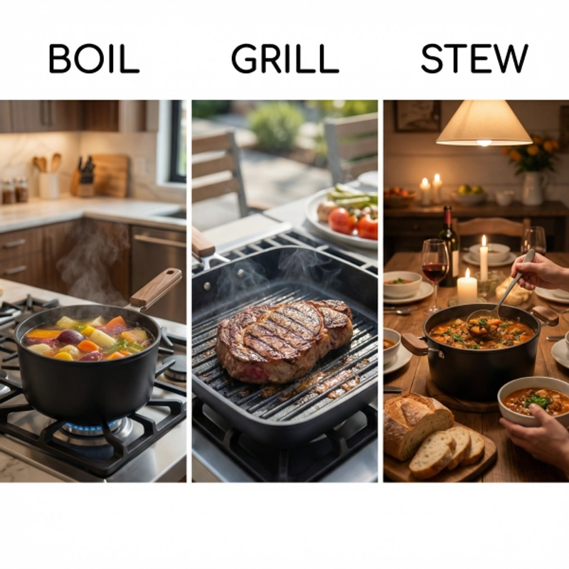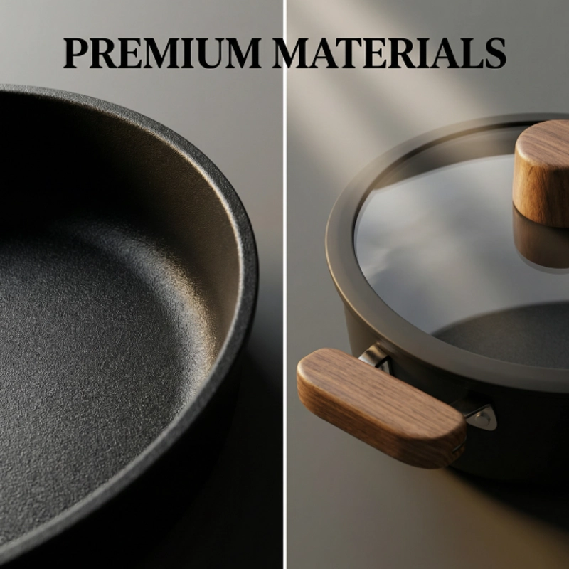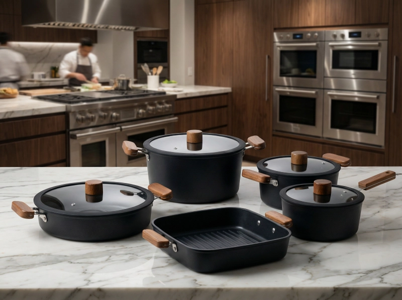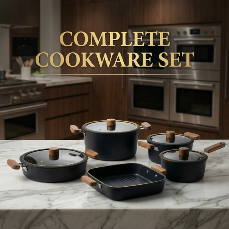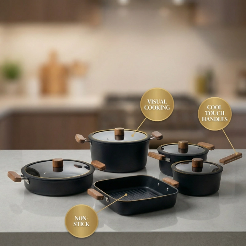 Non-Stick Cookware Set Pots Pans Square Grill Pan Durable Stylish Easy to Clean with Wooden Handles