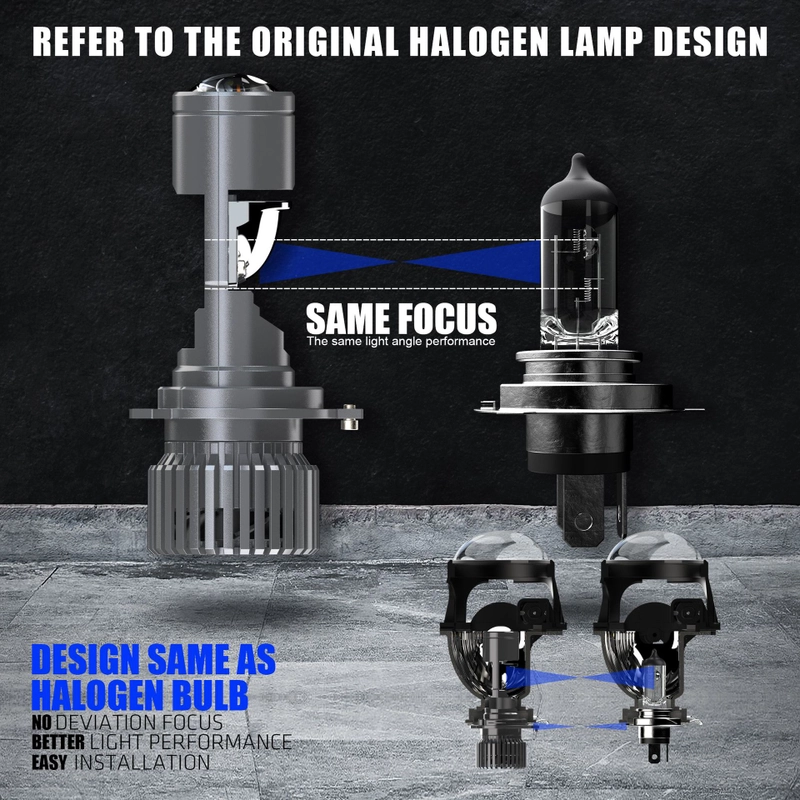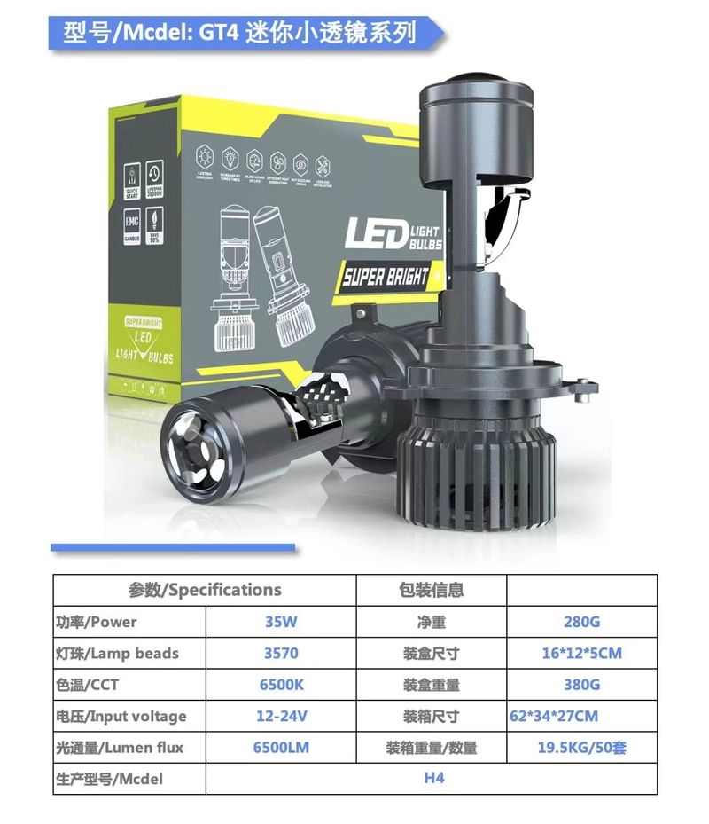 GT4 LED headlights with integrated lens, H4 dedicated model, high and low beam integrated, 12V/24V, motorcycle headlights with laser super brightness.